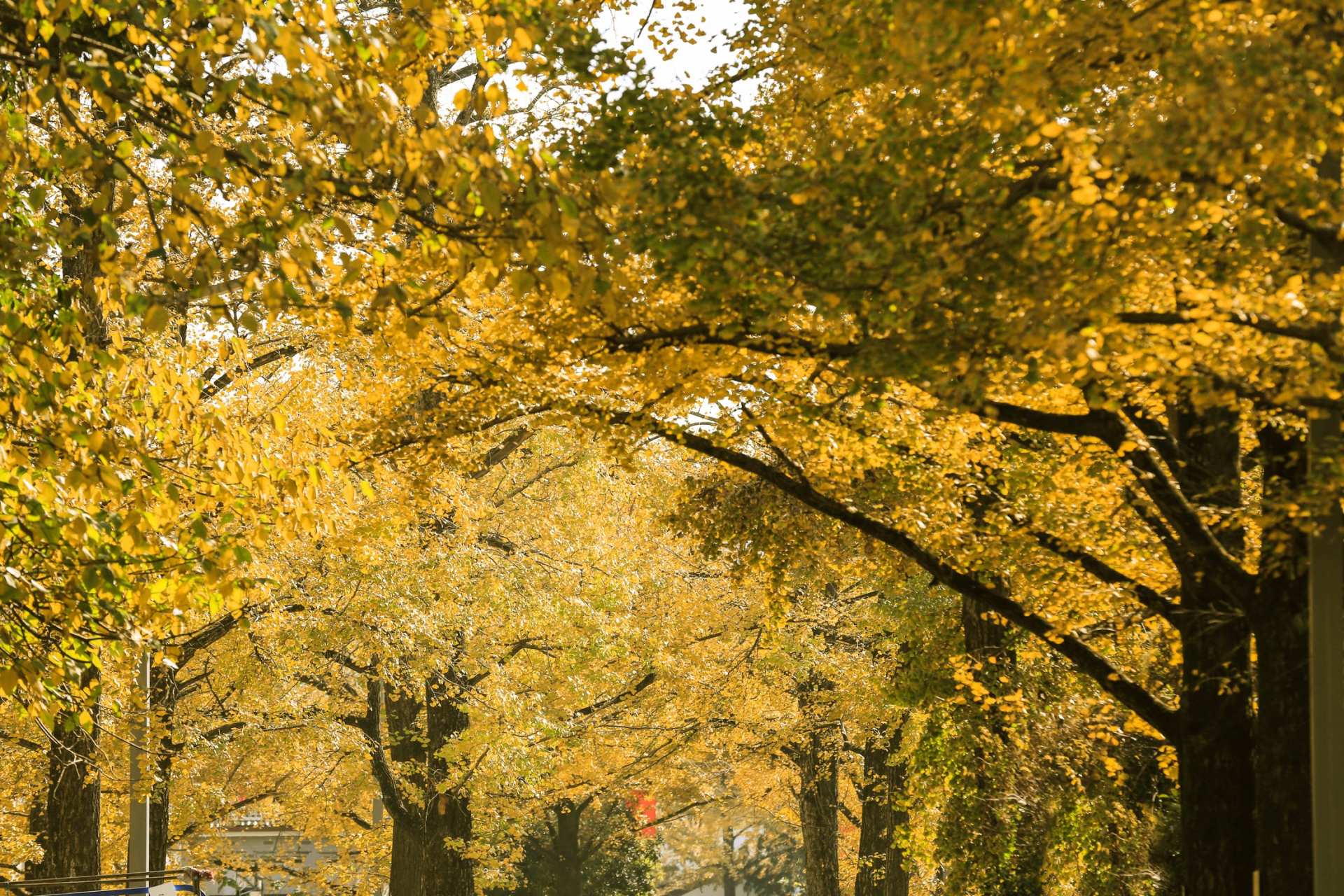 自日出緩緩而行,大道兩側(cè),銀杏高聳,枝葉繁茂。